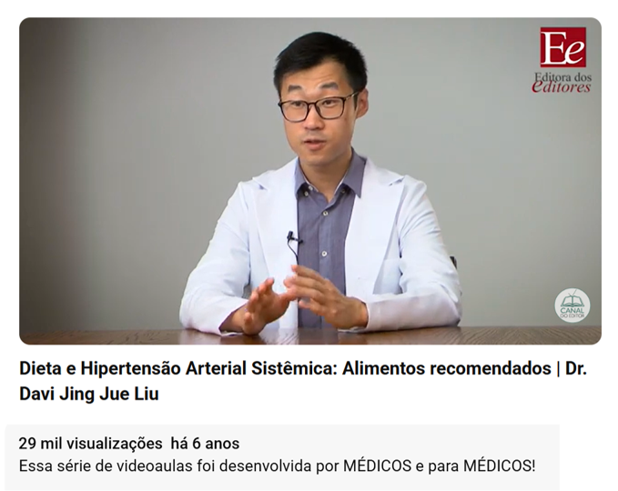 Produzimos para a Editora dos Editores vídeo aulas de educação médica continuada e vídeos de informação ao consumidor, como este, Dieta e Hipertensão Arterial Sistêmica: Alimentos recomendados, do Dr. Davi Jing Jue Liu, que teve até o momento 29.000 visualizações.